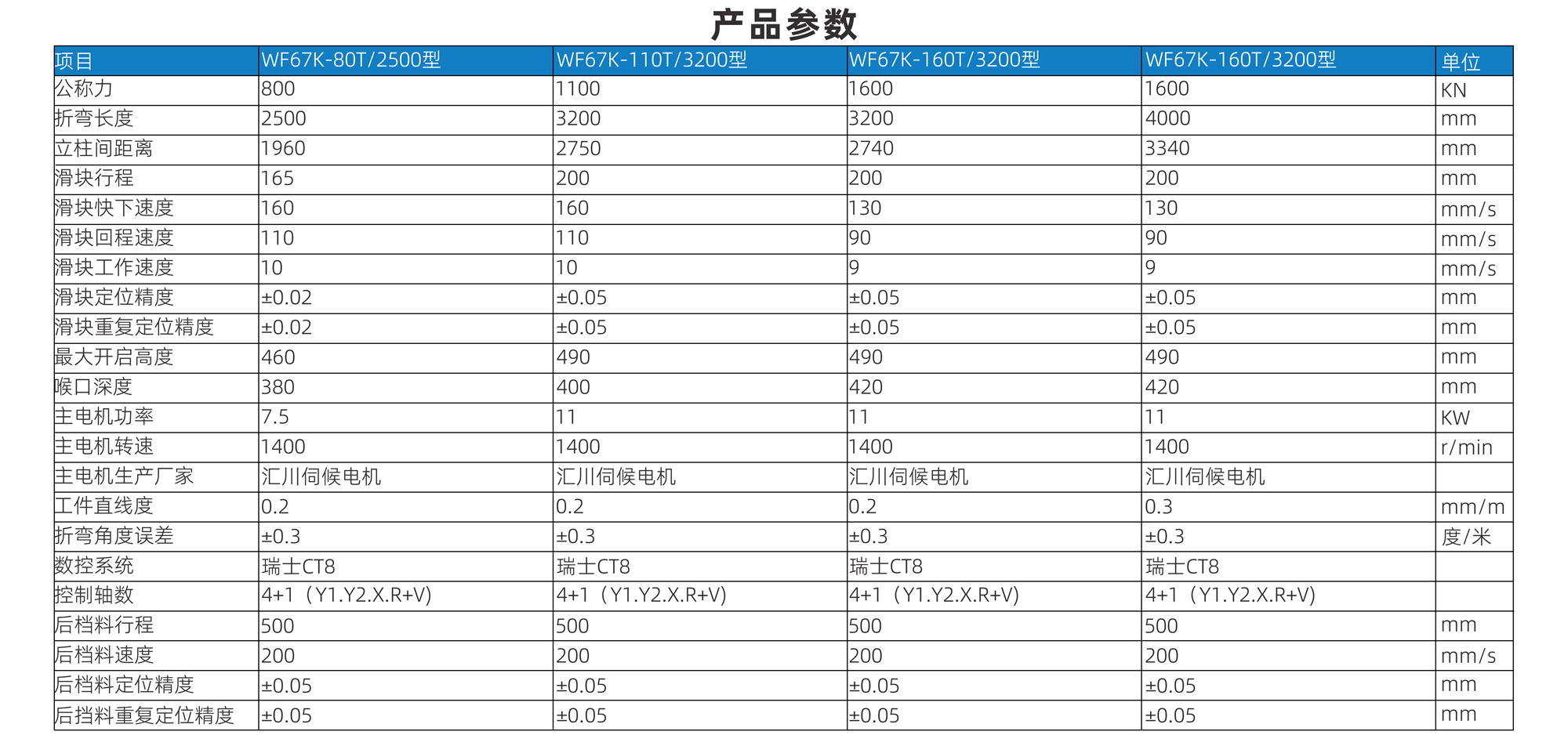 | 型號(hào) | WF67K-80T/2500型 | WF67K-110T/3200型 | WF67K-160T/3200型 | WF67K-160T/3200型 | 單位 |